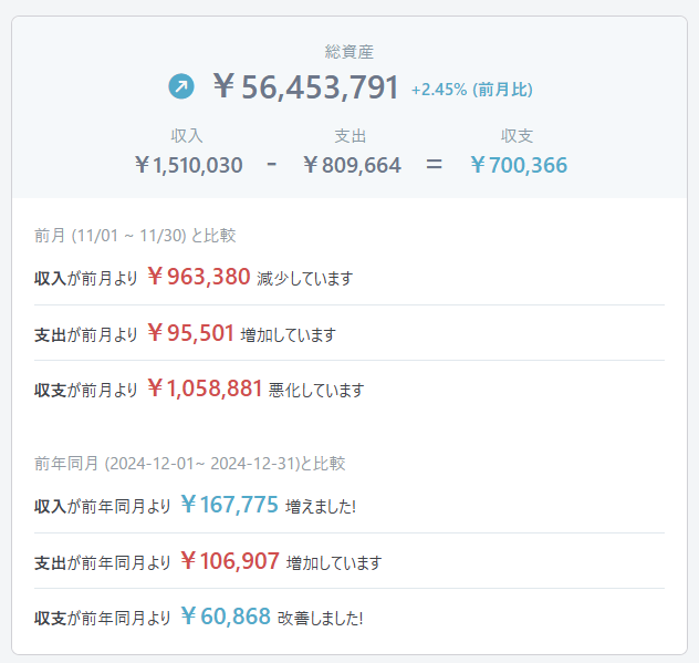 12月の貯蓄率は、1,510,030円(収入)-809,664円(支出)=700,366円(貯金)なので、