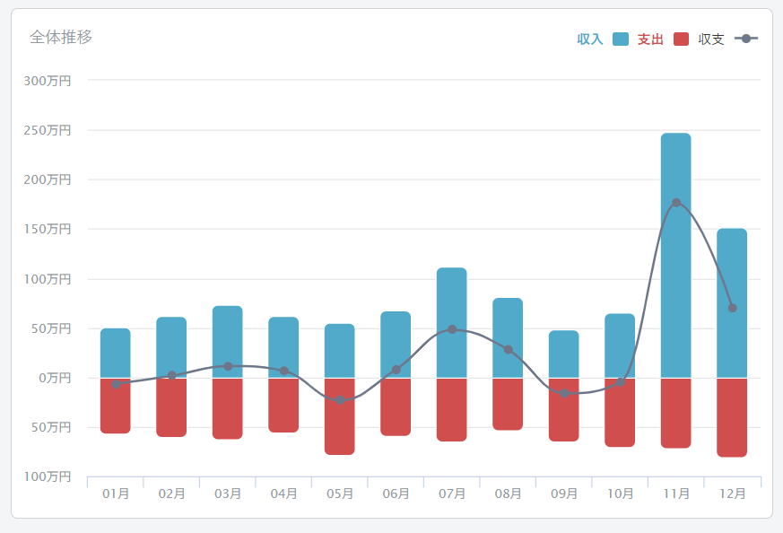 今年は年間支出が若干抑えられた印象ですが、相変わらず右肩上がりは止まらず……。ただ、配当金がキレイな右肩上がりなのは嬉しいです。
