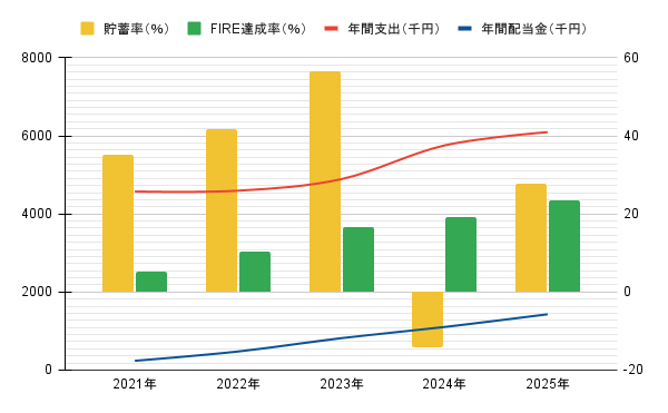 赤線の「年間支出」と青線の「年間配当金」が交わる(緑棒が100%⦅フルFIRE⦆になる)のを目標にしています。